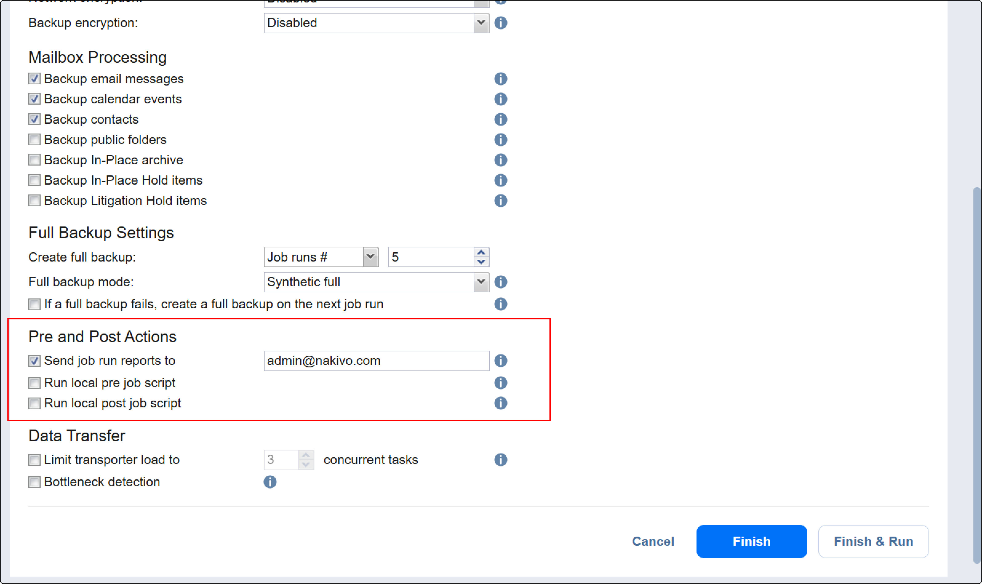 With NAKIVO Backup & Replication, you can enable certain actions before a backup job begins and after it is completed. You can choose to send job run reports and run local pre- and post-job scripts. For more information, refer to Pre and Post Job Scripts.
