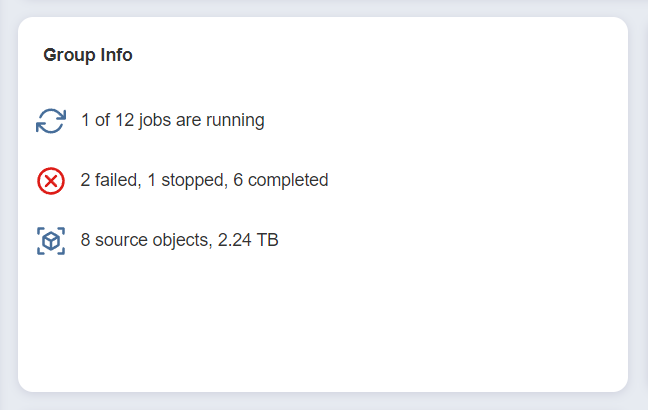Target Storage: The target storage(s) of the jobs in the chosen group. To open the popup with additional information about it (Data storage type, Free space, Used space, Transporter, Path, Compression, Deduplication, Space savings fields), click this target storage.
