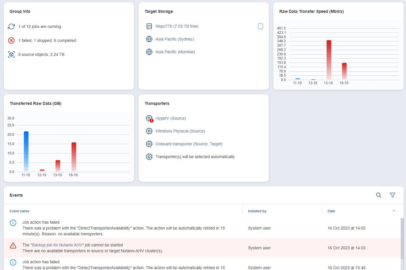 Raw Data Transfer Speed (Mbit/s): The raw data transfer speed for previous job runs (if no job in the group is currently running) or current job run (if a job is currently running). If a job run includes multiple backup objects, the aggregated data transfer speed of all backup objects is displayed.