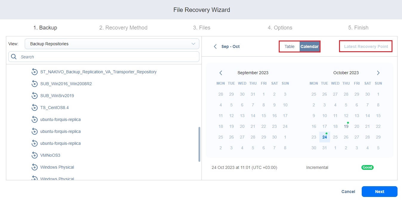 In the Calendar view, select a date or click Latest Recovery Point to select the date with the latest recovery point.