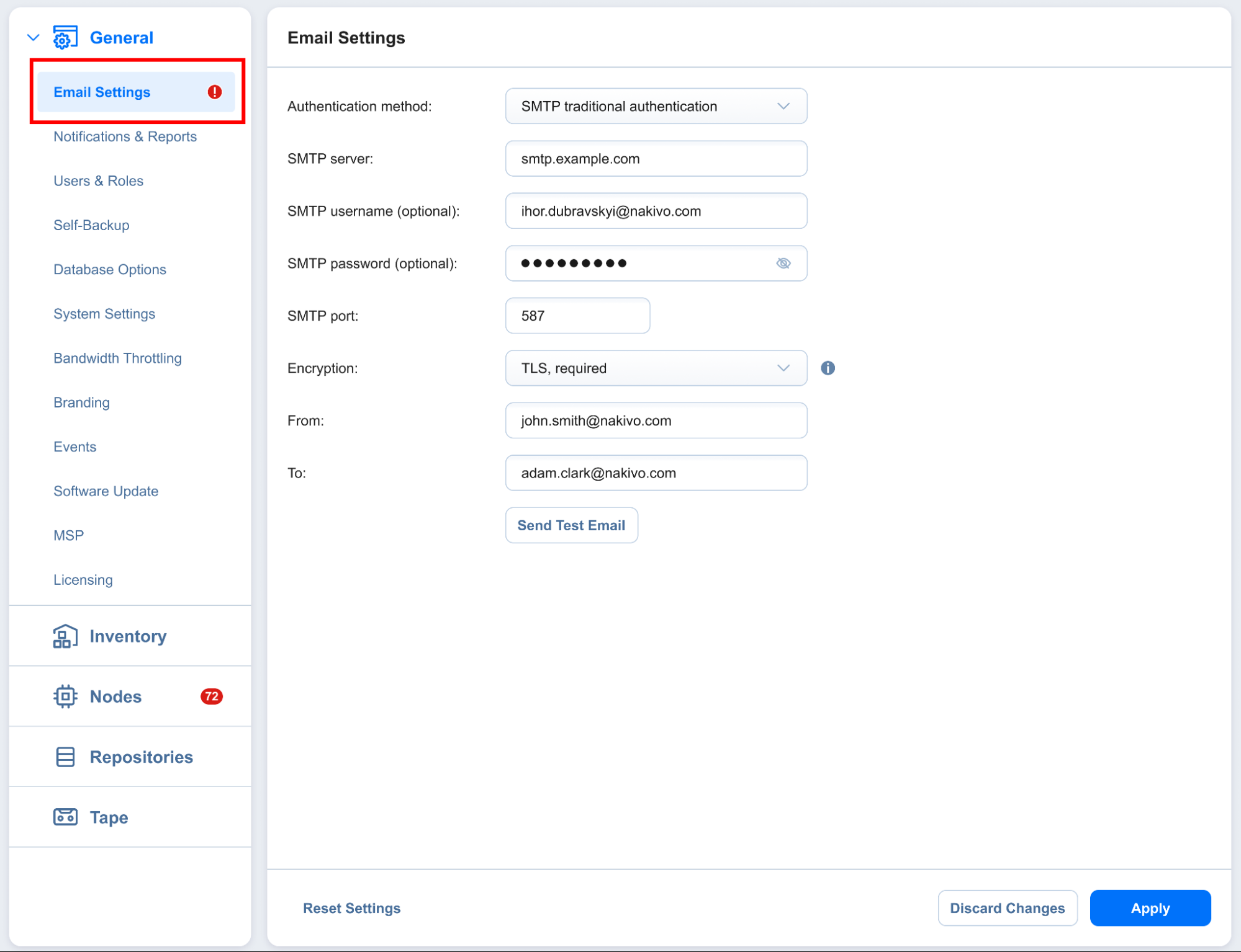 If you use an email with two-factor authentication, grant access permissions to NAKIVO Backup & Replication via your account security settings and generate a unique password. When configuring email setting of the product, enter this password in the SMTP password box.-