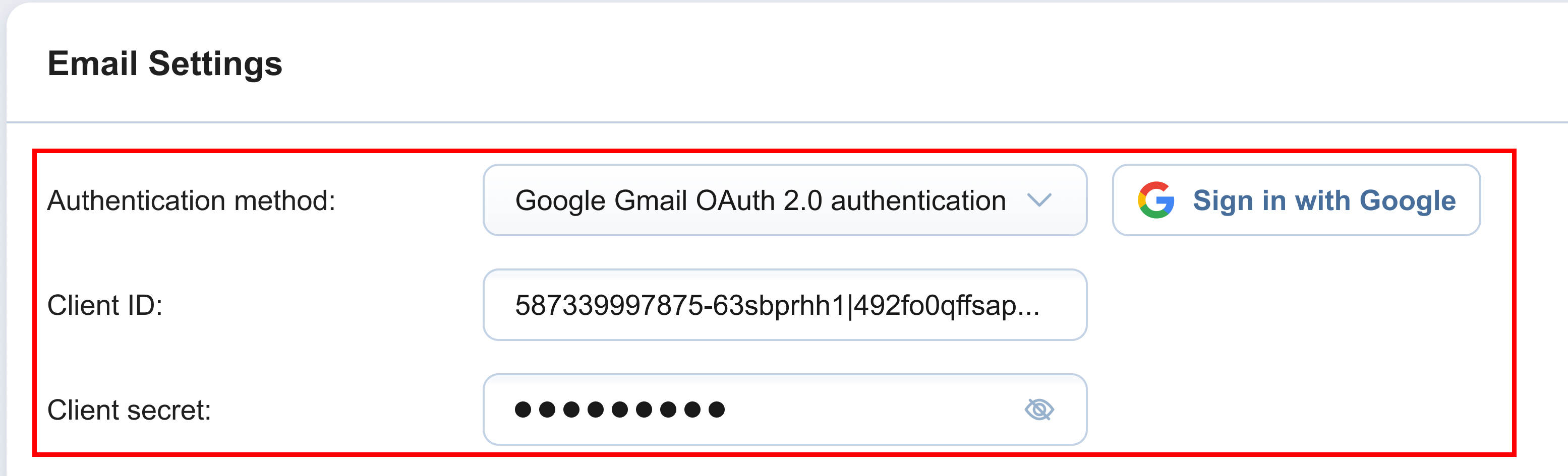 Google Gmail OAuth 2.0 authentication: Select the Google Gmail OAuth to connect your mail server, then configure the following parameters. For more information, refer to Using Email with Gmail OAuth Authentication.