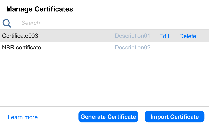 Client Certificate: Choose a saved certificate from the drop-down list to use an existing certificate. If you don’t have any saved certificates or want to generate a new one, click the Manage certificates button. In the resulting pop-up, you can edit and delete existing certificates, generate new certificates, or import existing certificates.