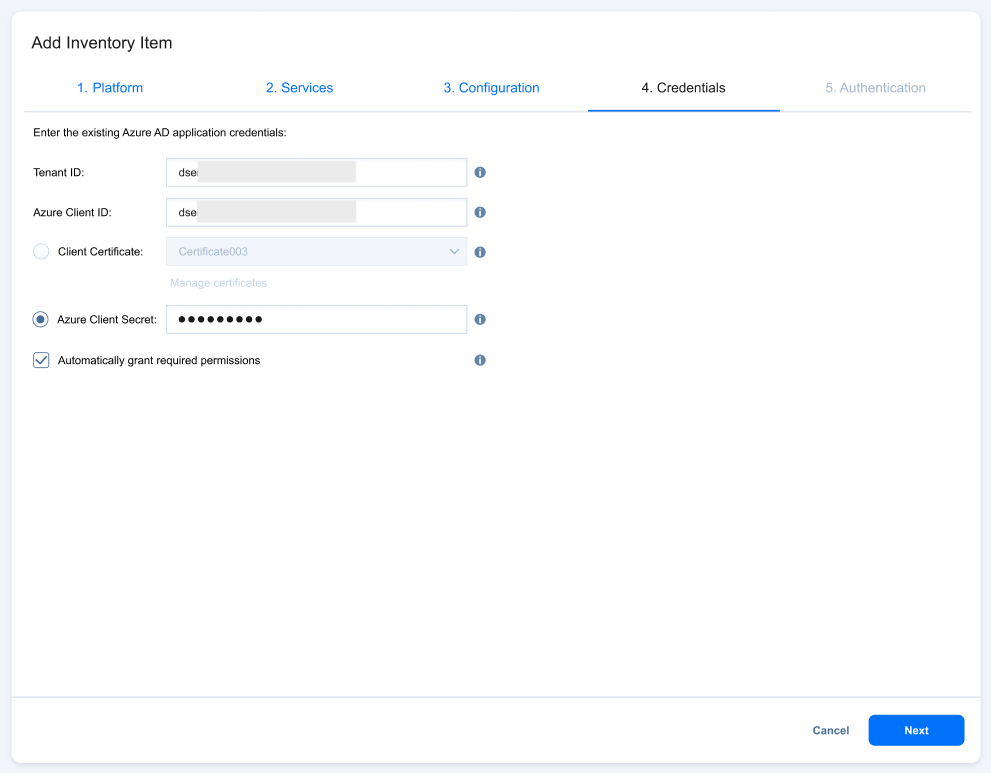 If you have selected Automatically grant required permissions or Automatically grant required permissions and register certificate on the Credentials page or Automatically register a new Azure AD application on the Configuration page, the Authentication page opens. Do the following: