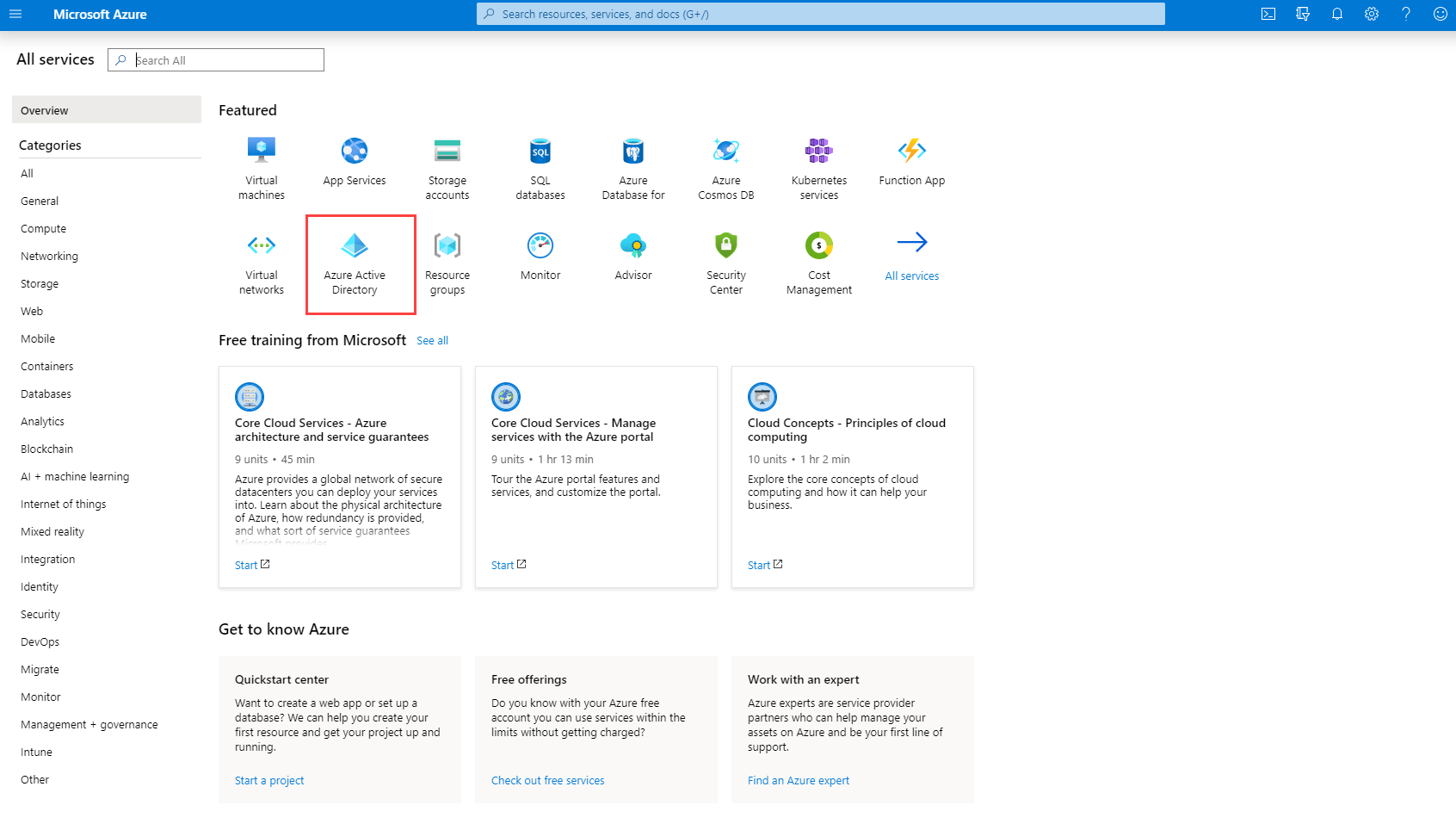 Select Azure Active Directory from the Dashboard or from the Portal Menu.