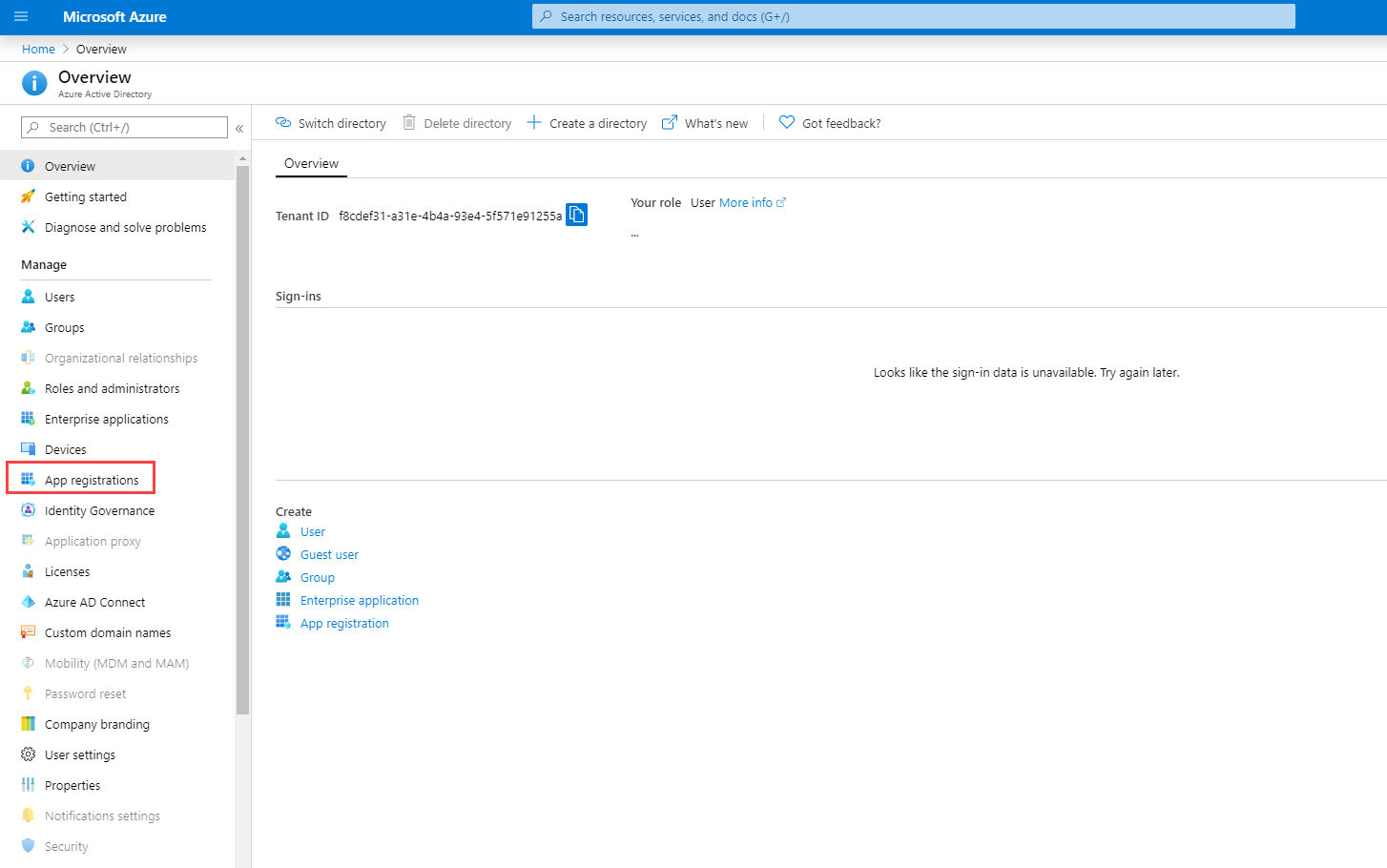 In the left menu, click App registrations.