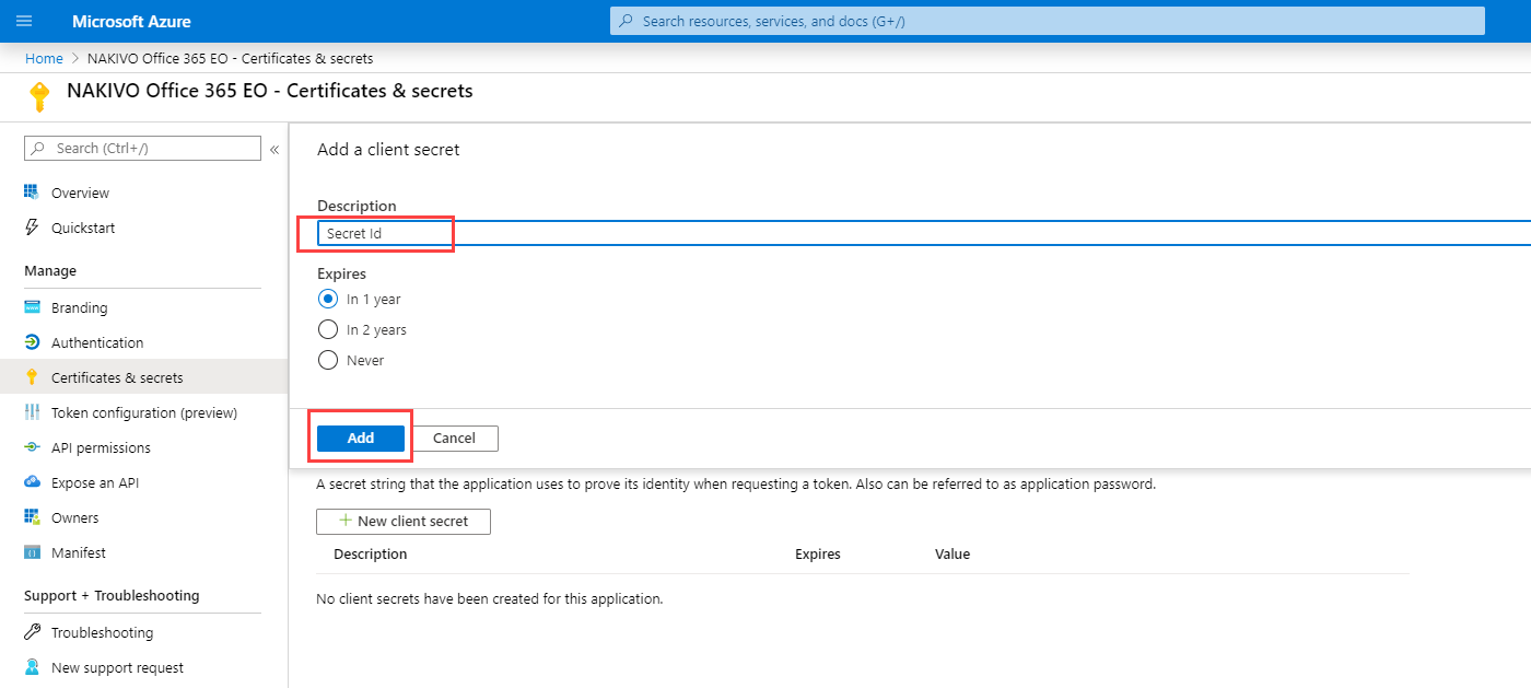Enter a description for the client secret, select the expiration period, and click Add.