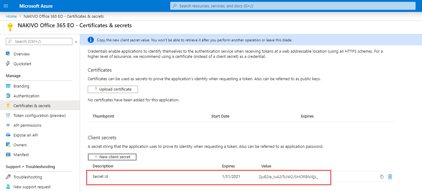Click Certificates & secrets > New client secret to create a new client secret for your app.