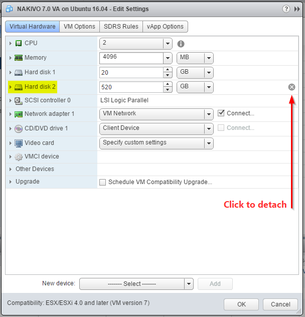 Select an Existing Hard Disk from the New device drop-down list.