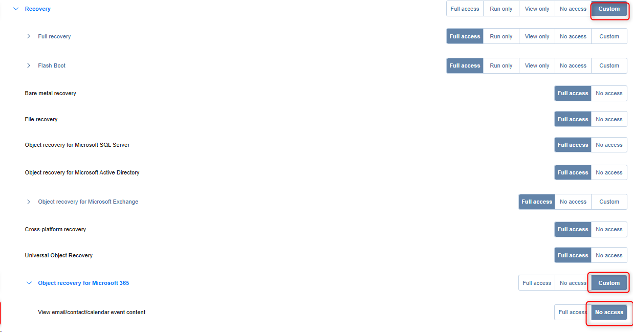 Under the Recovery > Object recovery for Microsoft 365 section, set the View message content permission to No access.