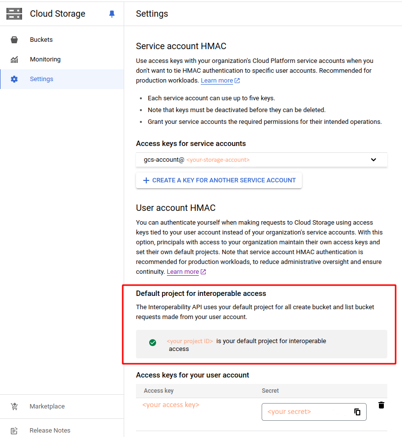 Navigate to the Cloud Storage settings, open the Interoperability > User account HMAC > Default project for interoperable access, and click Set <PROJECT-ID> as default project.