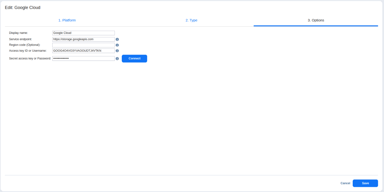 Use this endpoint and HMAC keys when adding the Google Cloud Storage to the NAKIVO Backup & Replication.