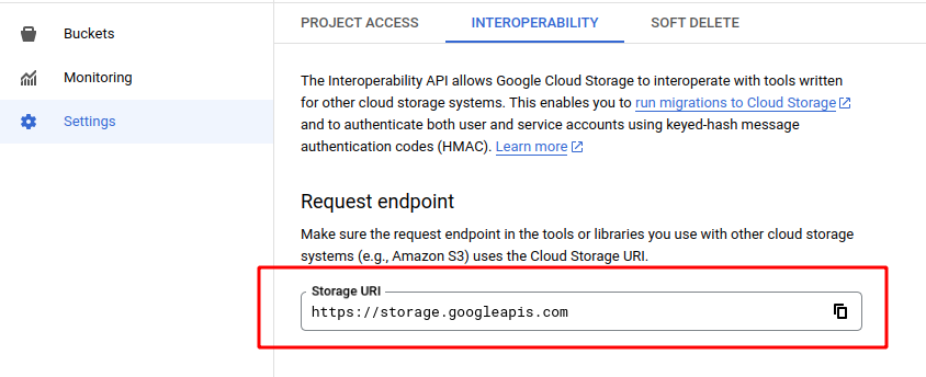 Go to Interoperability > Request Endpoint and change the endpoint to https://storage.googleapis.com.