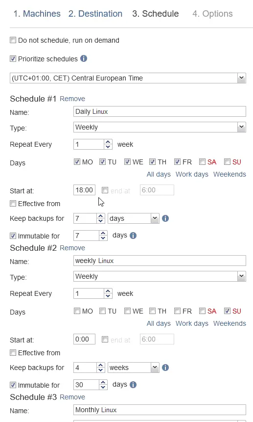 Set the schedule and retention settings or choose on-demand execution. Use a grandfather-father-son scheme.