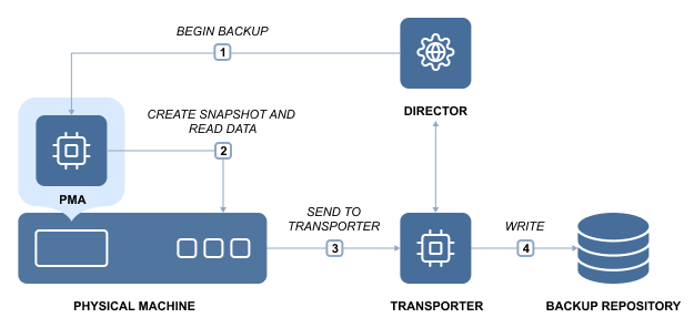 To ensure your physical machines are successfully backed up and recovered, you need to add a new physical machine to the product inventory first. Support for physical machines is done via the Physical Machine Agent (PMA) deployed in the physical machine OS. Communication between the Director and PMA is secured by means of a Certificate and Pre-shared Key generated by the Director and then injected into the PMA. During a physical machine discovery, NAKIVO Backup & Replication checks to see if the PMA is already installed on the physical machine. If the PMA is detected, the product adds the physical machine to the inventory. If the PMA is outdated, it is automatically updated. If the PMA or a Transporter is not detected, the product: