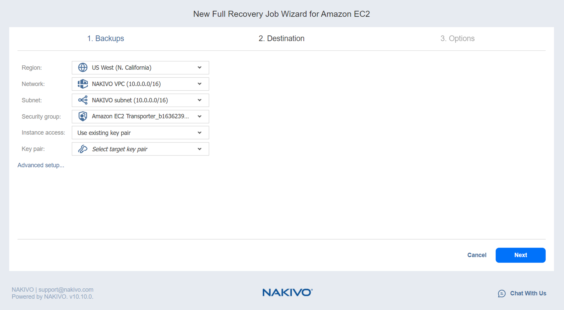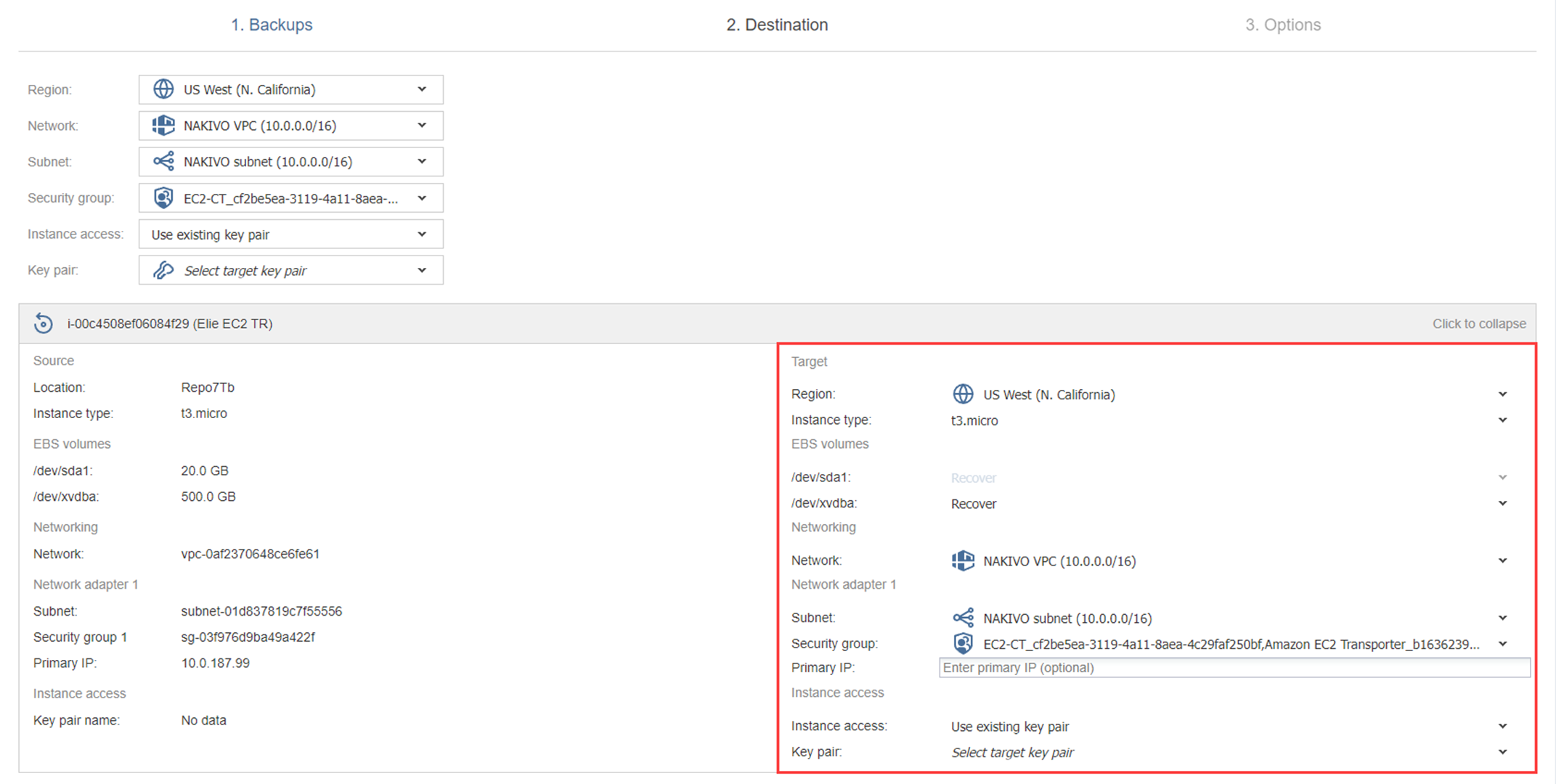 Recovery Job Wizard for Amazon EC2: Destination