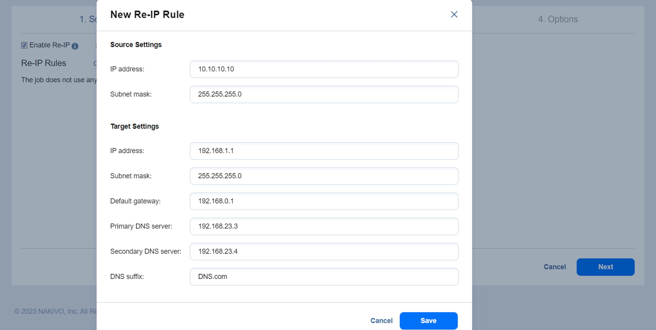 Note that you can use wildcards for IP addresses. For example, if you enter 192.168.1.* -> 10.30.30.* for the re-IP rule, a source VM IP address such as 192.168.1.50 will be changed to the 10.30.30.50 IP address for your failover job.