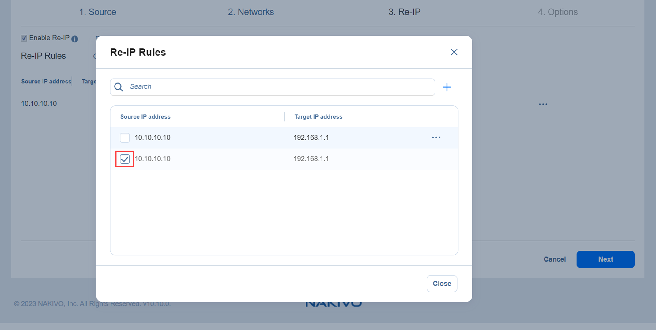 The Re-IP dialog box opens. In the list of your source VMs, select at least one VM and close the dialog box.