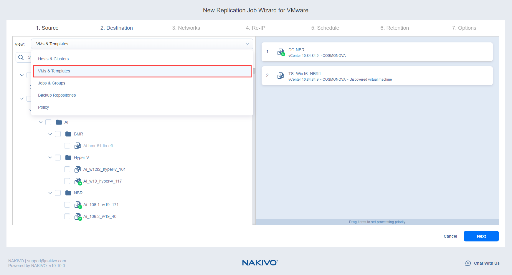 On the Source page of the wizard, select one of the views to add VMware items to your replication job.