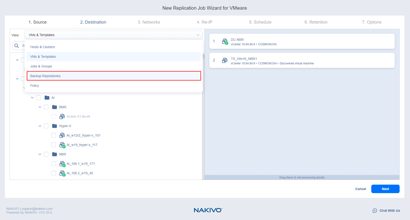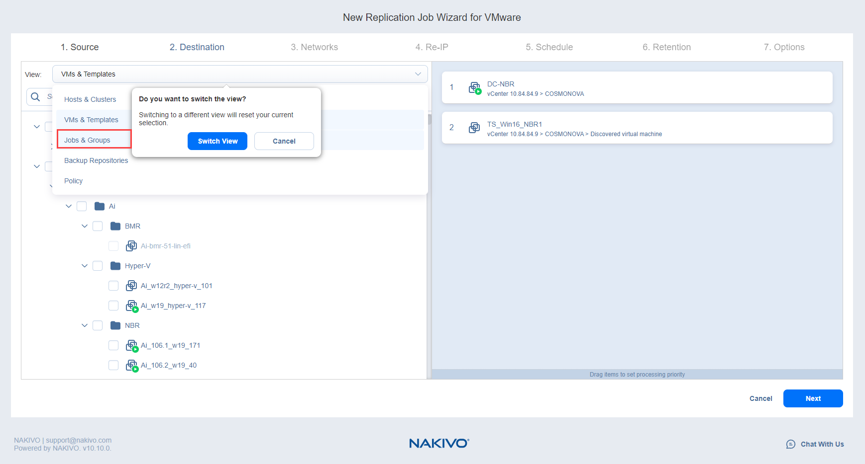 When the Jobs & Groups view is selected, the inventory tree displays groups, jobs, and backups of the appropriate hypervisor. Selecting a backup from the list allows you to replicate VMs directly from the backup (Refer to Replication From Backup). Proceed as described for the Hosts & Clusters view above.