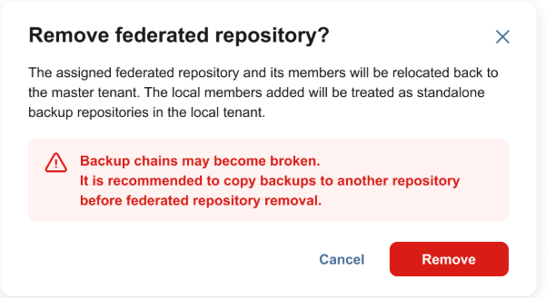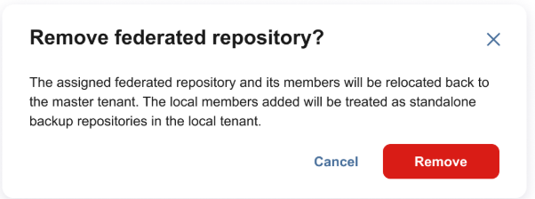 If a federated repository was assigned by the Master tenant, has at least one member in local tenant, does not contain any backup objects, the recovery points of which are distributed across several members, the following dialog box is displayed:
