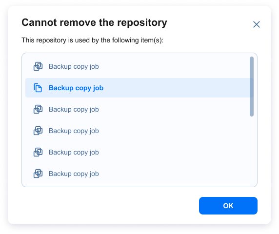 If a federated repository contains at least one backup object referenced by existing job(s), the following dialog box is displayed: