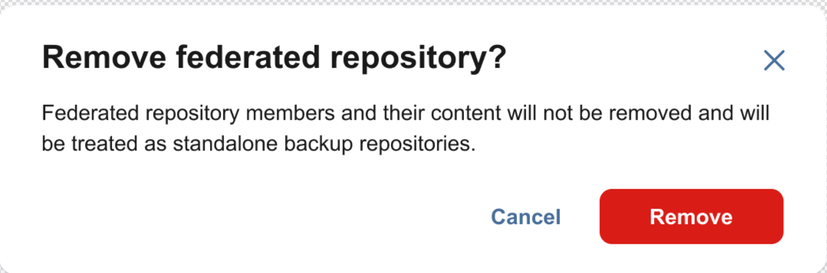 When you remove a federated repository, federated repository members and their contents are not removed and are treated as standalone backup repositories. However, the backup chains may be broken.