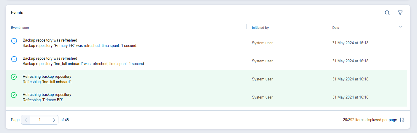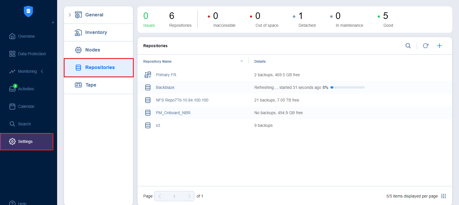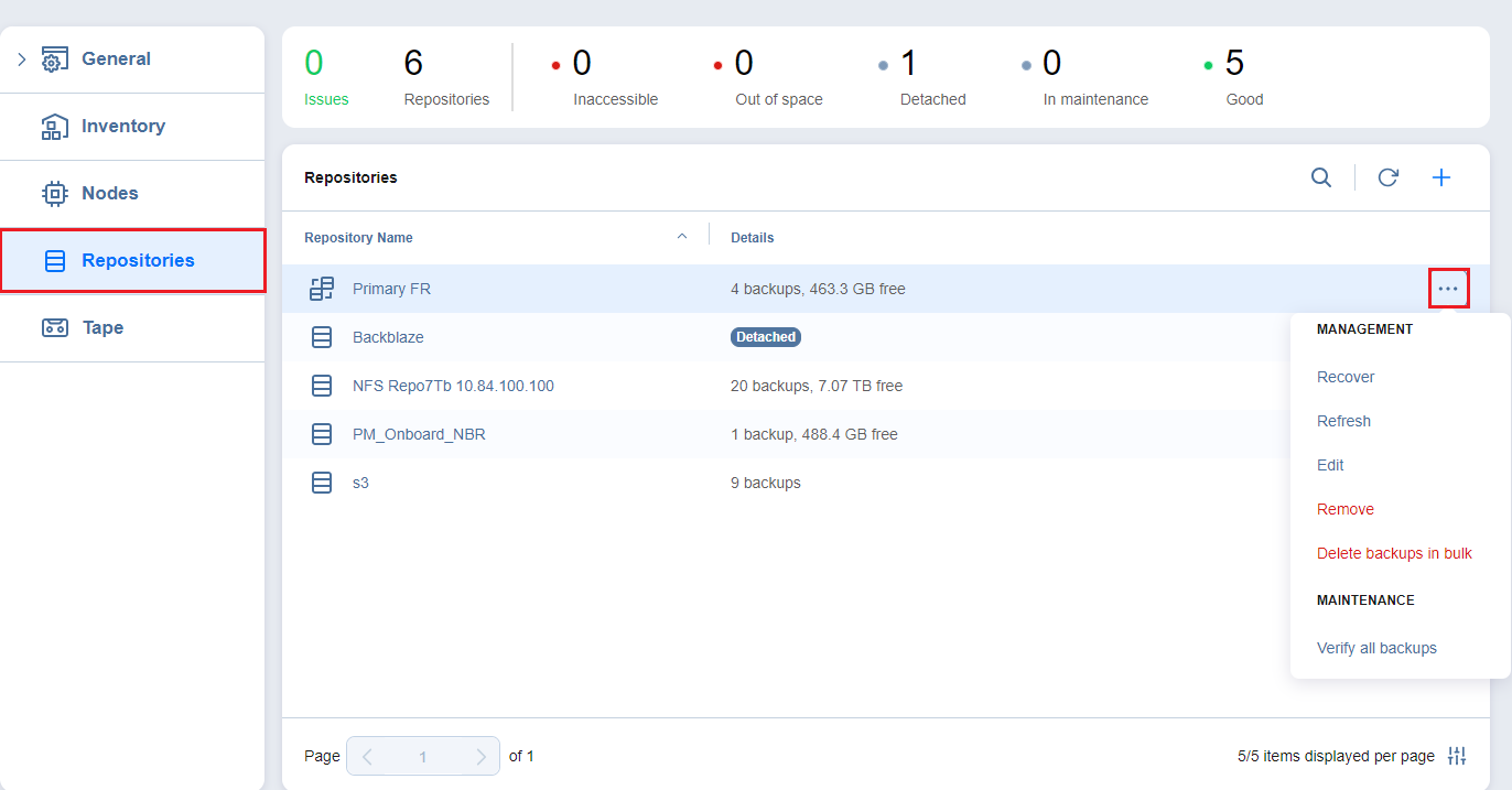 Details: The number of repository backups, amount of free space, and repository status (displayed for detached and inaccessible repositories only)