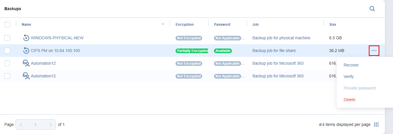 Available: All or some recovery points of the backup object are encrypted, and the password hash is available for all encrypted recovery points.