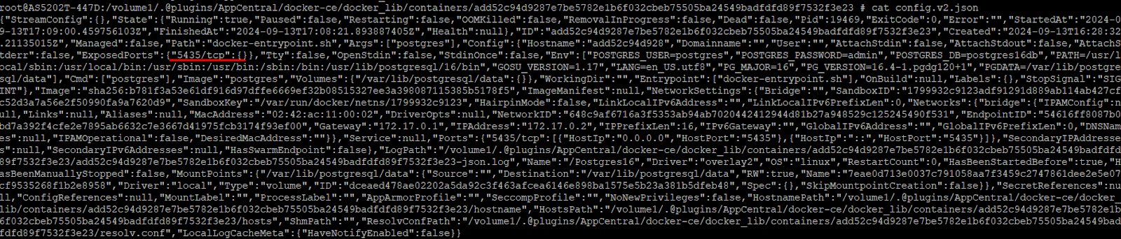 cd /volume1/.@plugins/AppCentral/docker-ce/docker_lib/containers/<containerID>. -