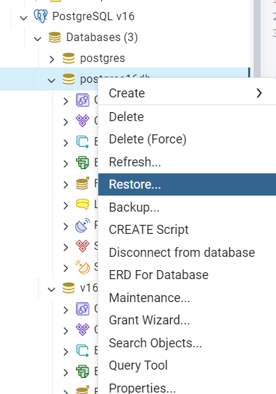 Ejecute los siguientes comandos para volcar la base de datos de PostgreSQL v13 y restaurarla a PostgreSQL v16: