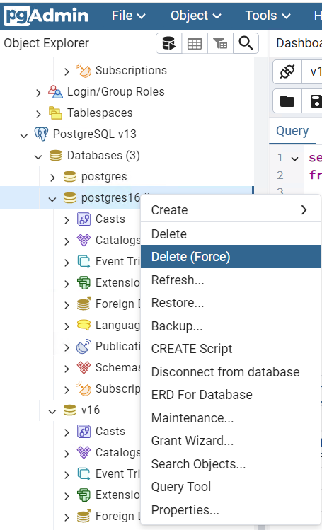 Para eliminar la base de datos de PostgreSQL v13, vuelva a pgAdmin, seleccione la base de datos y haga clic en Eliminar (Forzar) para eliminarla.