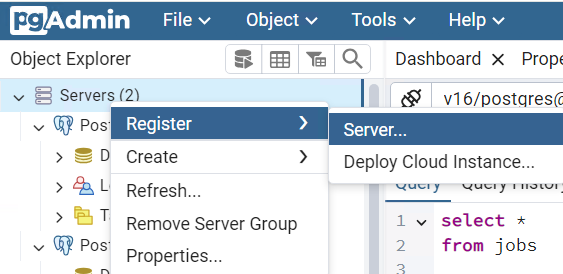 Registre el servidor PostgreSQL v16 en pgAdmin(usuario - postgres, pass - admin, puerto - puerto personalizado