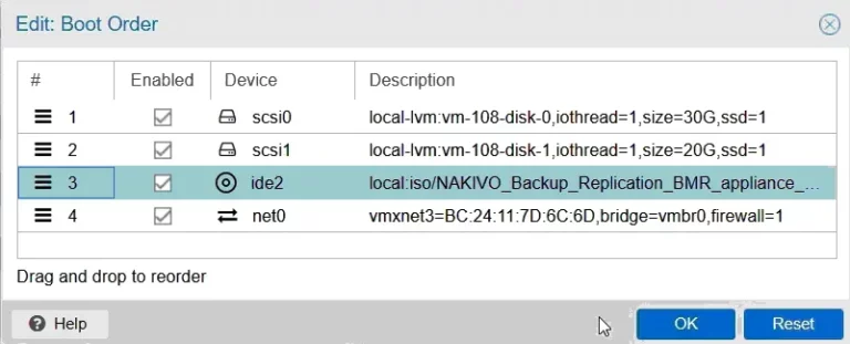 Haga clic en Opciones de la máquina virtual que desea recuperar y haga doble clic en Orden de inicio para editar el orden de inicio de la máquina virtual.