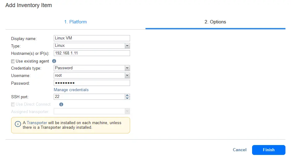 Seleccione la máquina virtual Windows Server del inventario, introduzca la dirección IP y proporcione las credenciales del sistema operativo.