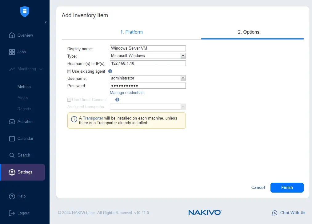 Se instalará un transportador NAKIVO en la máquina. Si falla la instalación automática, instala manualmente el transportador.