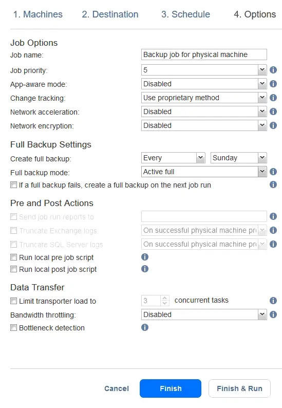 Establezca la programación y los ajustes de retención o elija la ejecución bajo demanda. Utiliza un esquema abuelo-padre-hijo.
