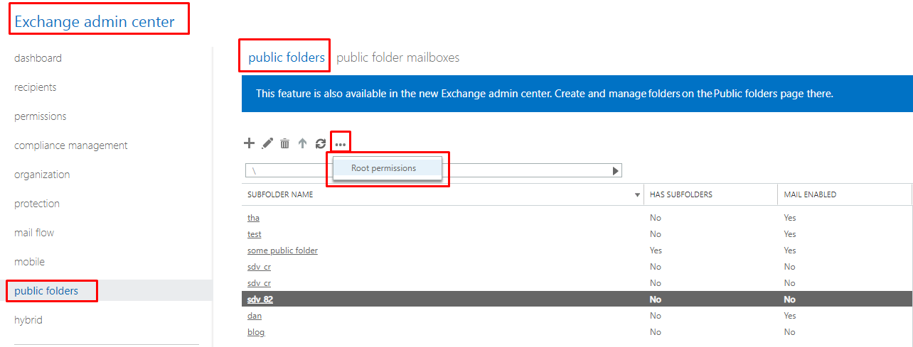 Para configurar estos permisos, empiece por iniciar sesión en Office 365 mediante una cuenta con privilegios de administrador. A continuación, vaya al centro de administración de Exchange haciendo clic en Centros de administración > Exchange. Del centro de administración de Exchange, haga clic en carpetas públicas en la parte izquierda de la página. A continuación, haga clic en el icono de la elipsis (...) y en Permisos de raíz.