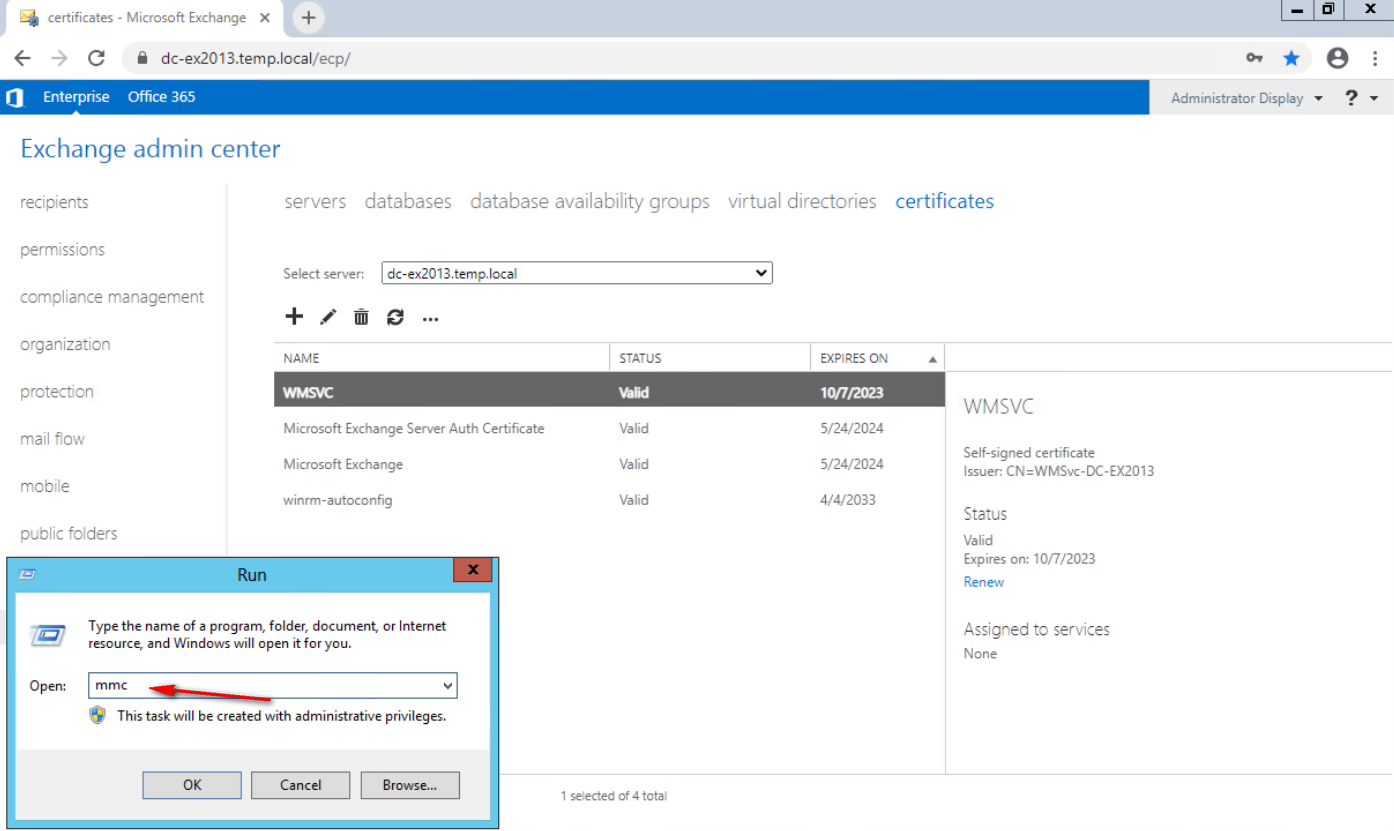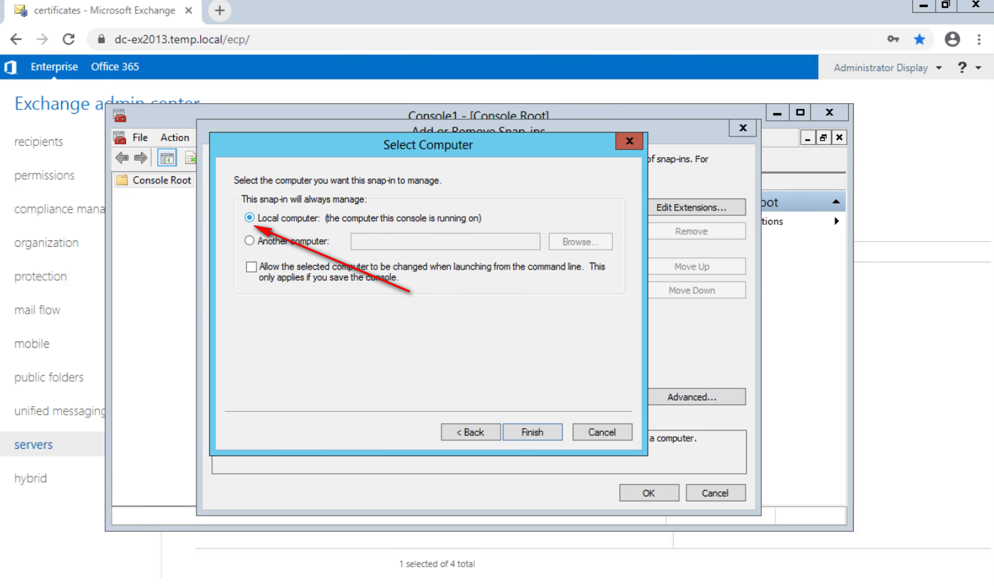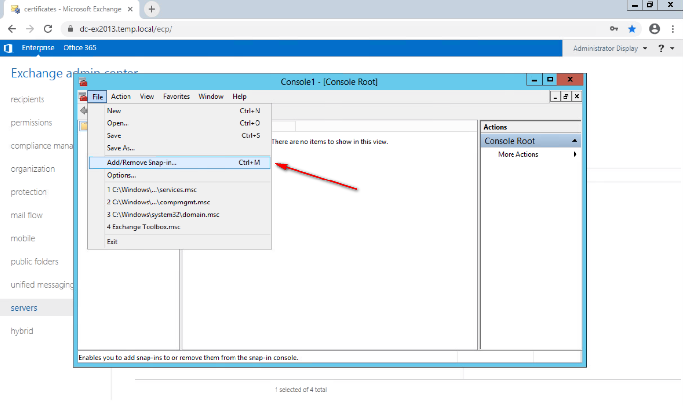 Abra el centro de administración de Exchange y vaya a Servidores>Certificados.