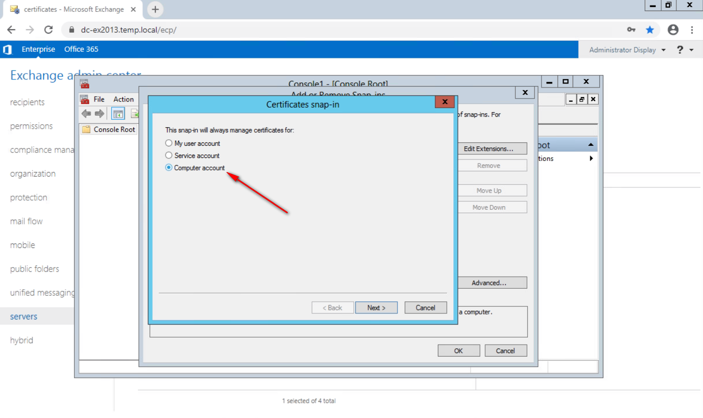 Se abre la ventana del complemento Certificados. Seleccione Cuenta de ordenador y haga clic en Siguiente.