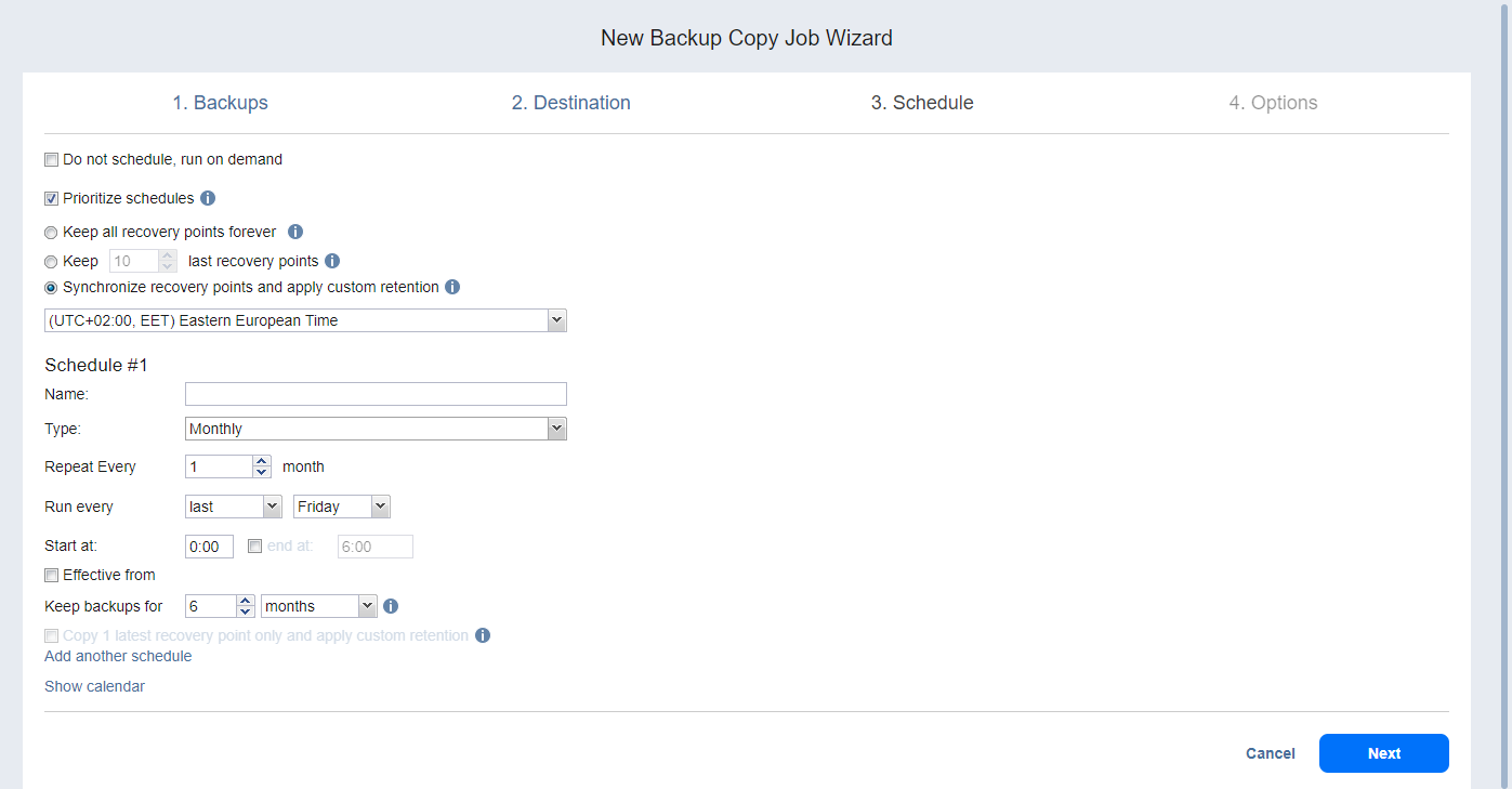 Priorizar las programaciones: Cuando se selecciona esta opción, NAKIVO Backup & Replication empieza a tratar los horarios en función de su prioridad. La Programación Anual tendrá mayor prioridad que la Mensual, etc. En caso de que se solapen 2 o más programaciones, se omitirán las programaciones con menor prioridad.