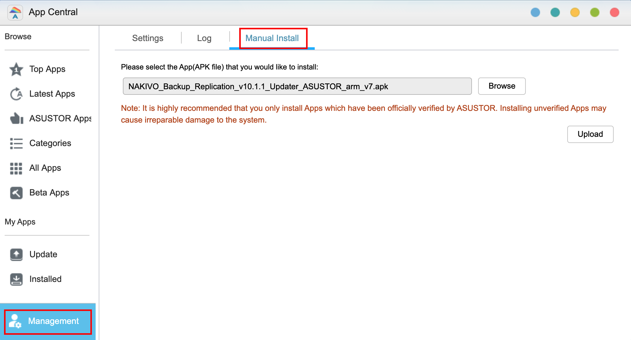 Siga los pasos que se indican a continuación para actualizar NAKIVO Backup & Replication en ASUSTOR NAS a través de App Central: