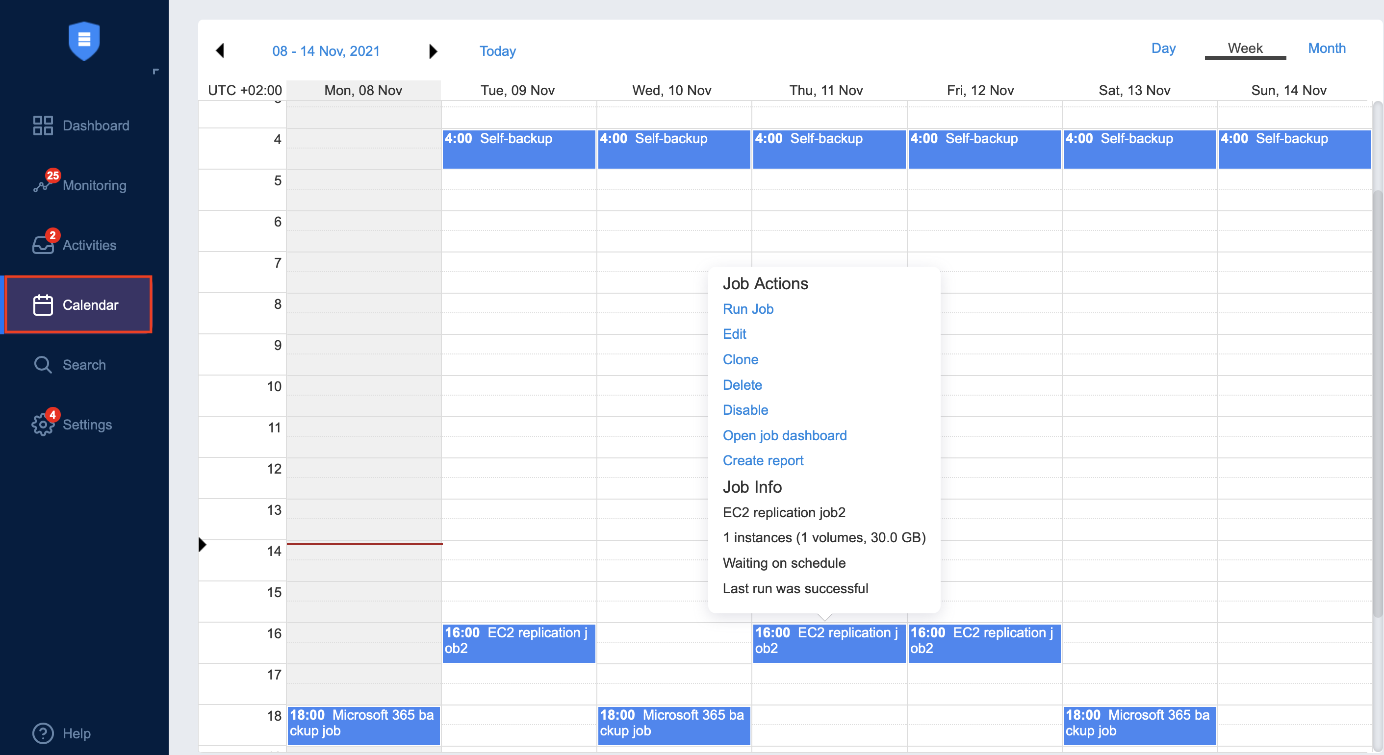 Programar jobs de protección de datos puede resultar complicado en entornos virtuales de gran tamaño, donde es necesario encajar varios jobs en una ventana de backups y evitar posibles solapamientos. Para resolver este problema, NAKIVO Backup & Replication cuenta con el panel de control Calendario, cuyo objetivo es mejorar en gran medida la programación de jobs. El panel de control Calendario muestra todos sus jobs en la vista de calendario, el tiempo que tardaron los diferentes jobs en ejecutarse en el pasado y la duración prevista de los jobs en el futuro. Aquí puedes ver a vista de pájaro todos tus jobs y encontrar fácilmente franjas horarias abiertas para nuevos jobs, que puedes crear directamente en el panel. También puede visitar Jobs anteriores para ver el estado y los detalles de los jobs que se han completado y profundizar en sus detalles. El panel de control Calendario tiene una interfaz y una navegación intuitivas, similares a las de las aplicaciones de calendario más populares.