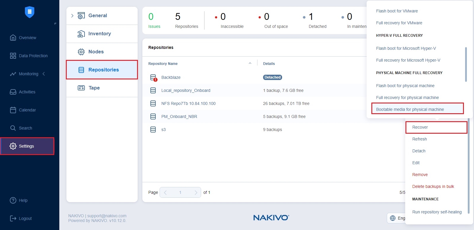 Para abrir el asistente de medios de arranque desde la pestaña Repositorios, haga clic en el botón GESTIÓN de la elipsis, haga clic en Recuperar y seleccione Medios de arranque para máquina física.