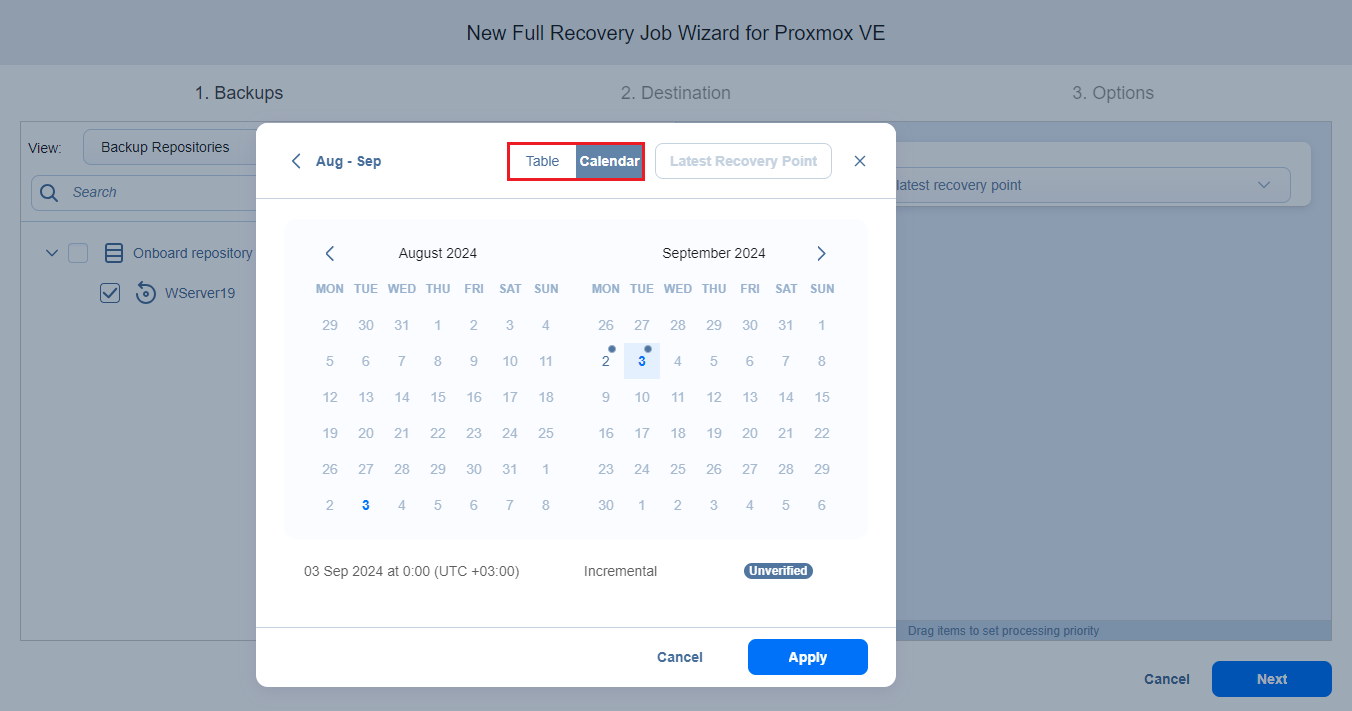 Editar para abrir el cuadro de diálogo Selector de puntos de recuperación en la vista Calendario o Tabla y elegir una fecha.