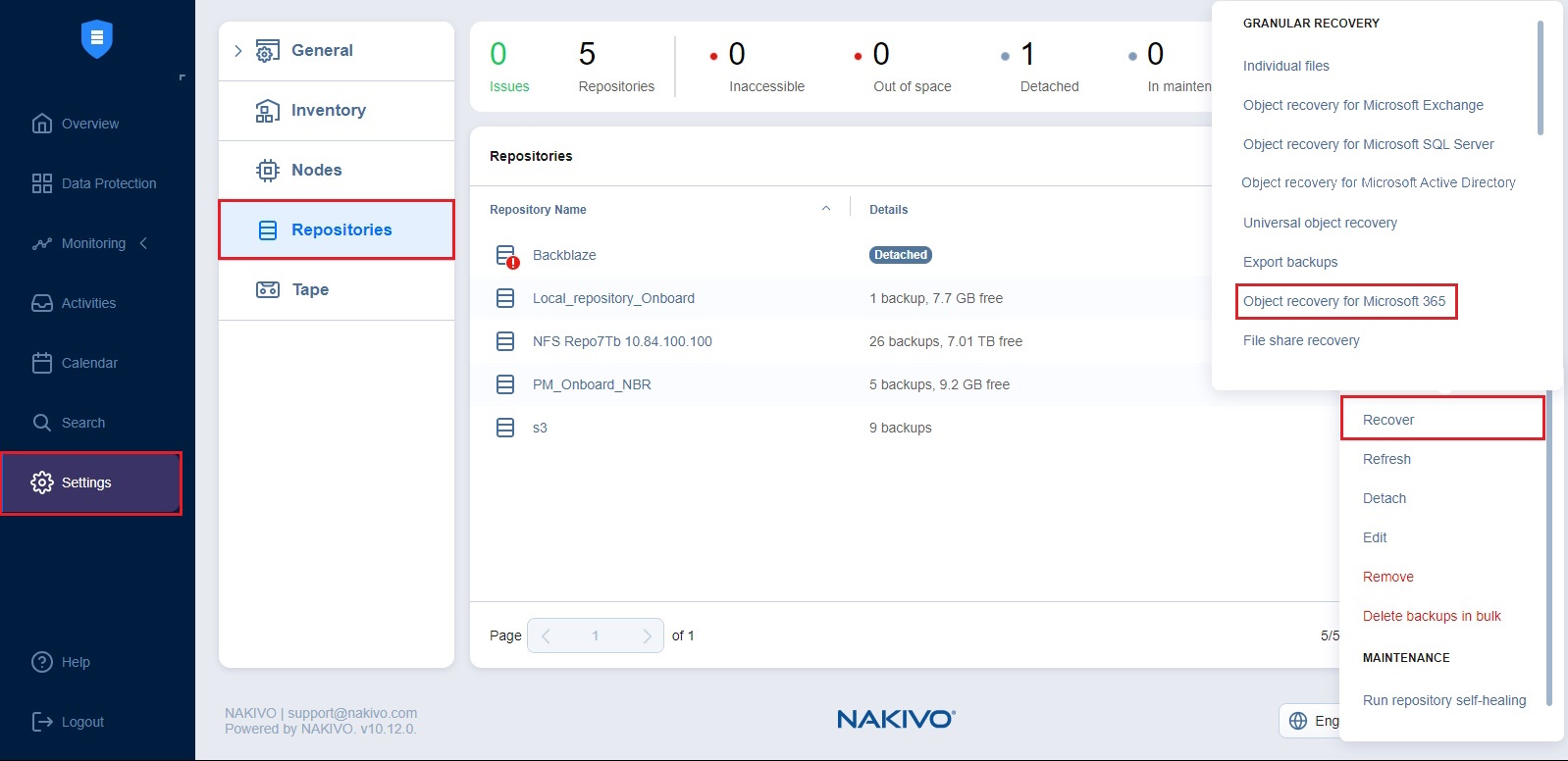 Puedes iniciar el proceso de recuperación desde el menú Protección de datos, utilizando la función Buscar o desde la página Repositorios en Configuración (por ejemplo, si ya no tienes un trabajo de backup, pero aún conservas la copia de seguridad). Consulte las secciones siguientes para obtener más detalles: