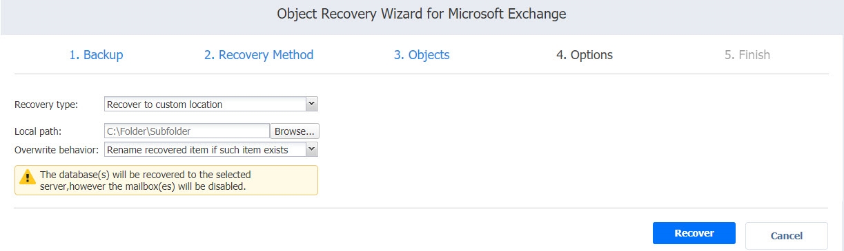 La recuperación en una ubicación personalizada no es compatible cuando se selecciona un buzón completo para la recuperación.