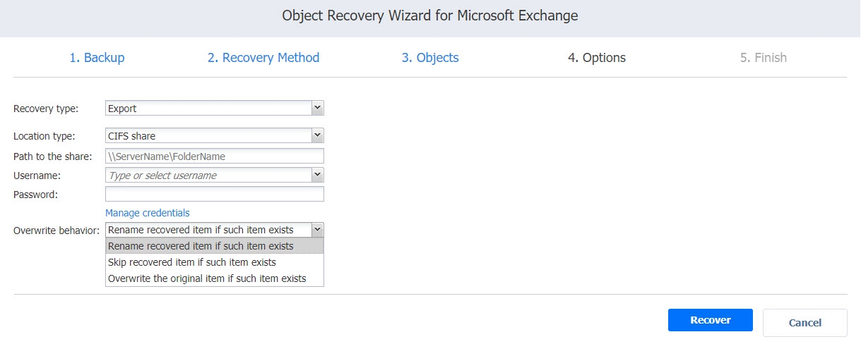 En la lista desplegable Tipo de recuperación, puede elegir Exportar para exportar Microsoft Exchange. Puede elegir las siguientes ubicaciones para la exportación: