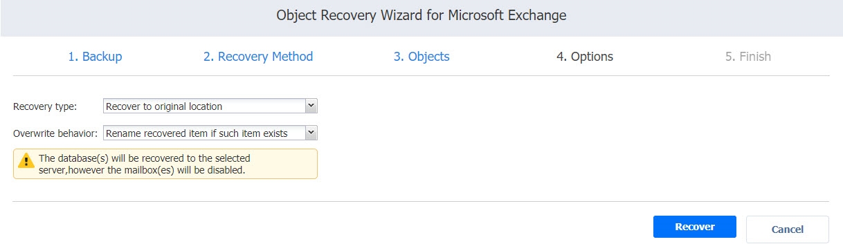 Asistente de recuperación de objetos para Microsoft Exchange: Opciones
