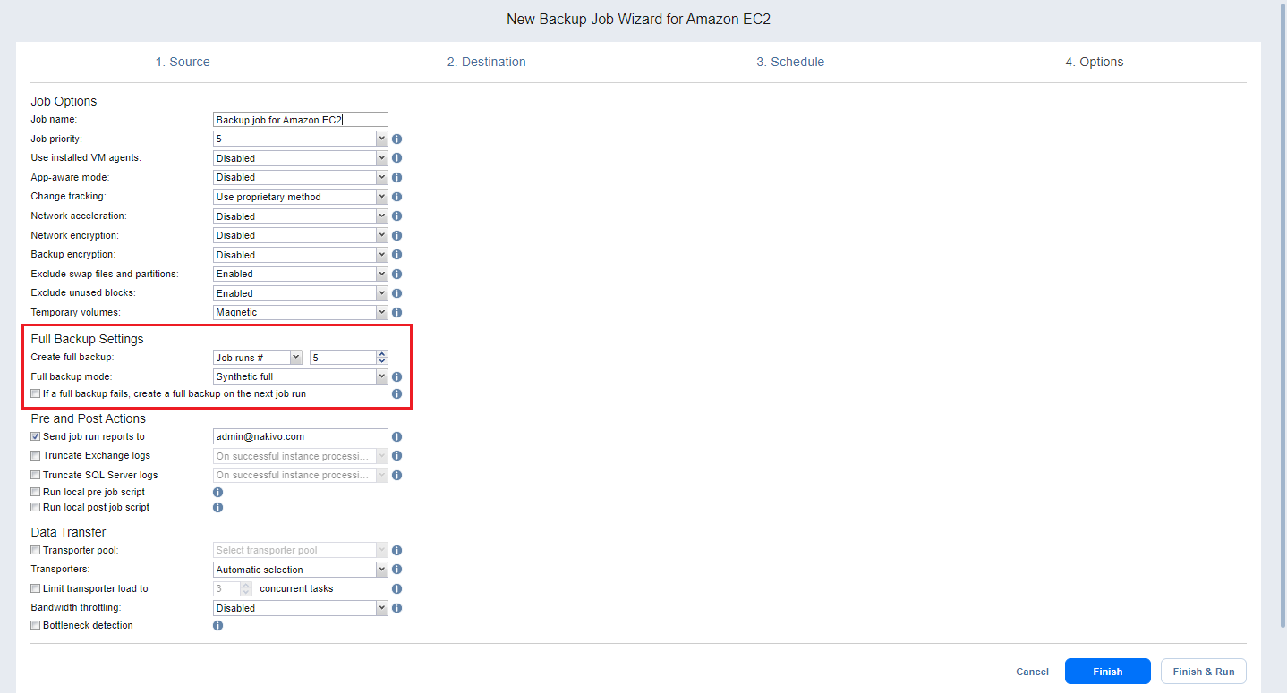 En la página Opciones del asistente, puede configurar varias opciones para su job de backup de Amazon EC2. Proceda como se describe en estas secciones: